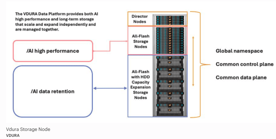 Many companies, such as HPE, NetApp, and Dell offer hybrid arrays. However, we’ll use the VDURA data platform as a case study, since it’s designed with high-performance computing and AI/ML storage in mind. It also has two other features that tie in with our previous discussion: it is an NVMe-first architecture, and it is designed to allow the use of commodity drives, including hard drives.